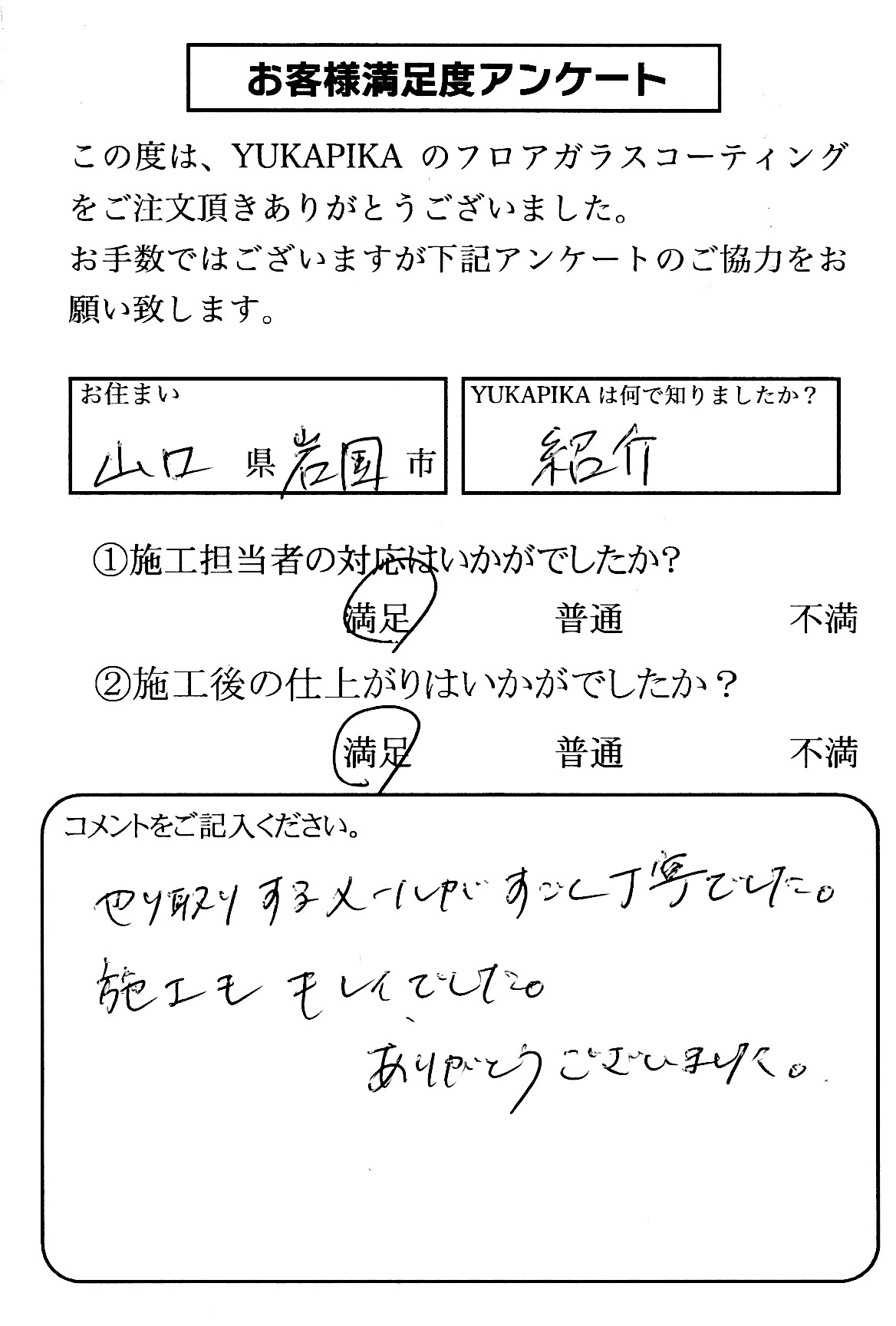 - 床のコーティングについて、多くの知識のある住宅メーカーの営業マンさんがすすめてくれたのと、何より15年以上にのぼるフロアガラスコーティングの施工実績と、コーティング塗料研究と技術開発を自社でやられていると聞き、コーティングに対する強いこだわりを感じた事が決め手です。