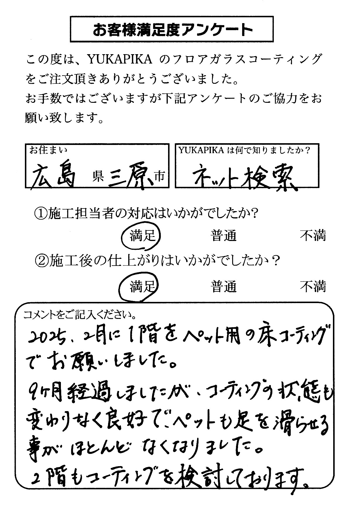 我が家のペットの犬が滑って転ぶこともなくなりましたし、何より新築時のようにピカピカな床になり、もうこれで私が死ぬまで大丈夫!だと思っています。もう安心です。 本当に良いものに出会ったことに感謝しています。